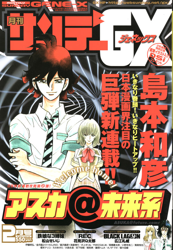 『アスカ@未来系』…未来から来たと言う大門アスカと女子高生上代愛果のボーイミーツガールもの(いや、ガールミーツボーイか)というんでしょうか。まだはっきりつかめません。軽くバトルも含まれていたり。ギャグの含まれ方は島本先生のこれまでの作品と同様のものです。今後どう展開していくか期待。