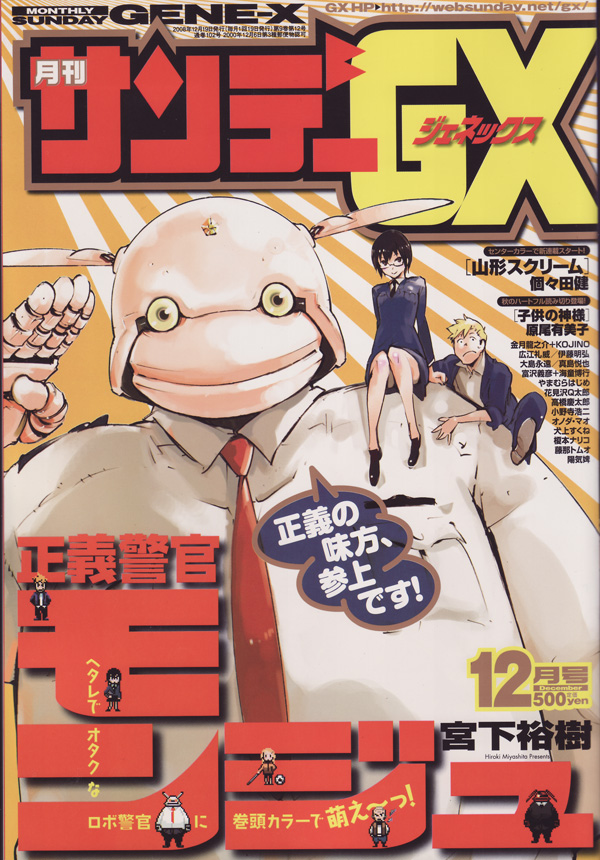 『山形スクリーム』…新連載。原作は来年公開の竹中直人が監督する実写映画のようです。絵の感じと言い、話の雰囲気と言い映画がどんな風になるのか想像できません。マンガはアクションホラーコメディーとうたっていますが、はたして。今回カラーもついてますが、今時珍しいのっぺりとしたというか、言い方悪いですが手が抜けているように見えてしまいます(セル画描きやすそうだ)。白黒部分も見る限り、カラー向きの作家ではなさそうです。